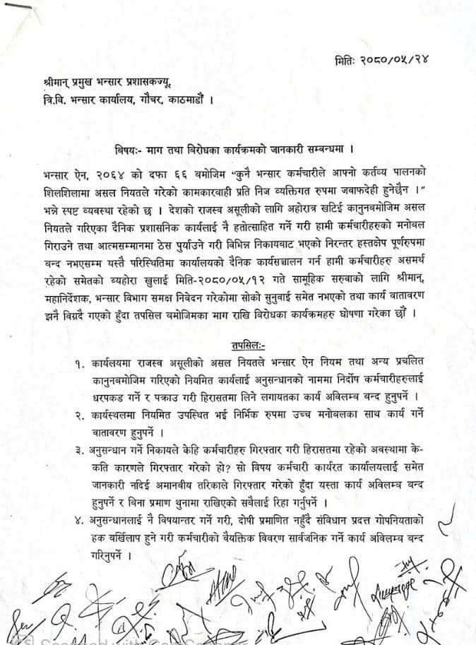कार्यस्थलमा डर त्रास विना, निर्भिक रुपमा उच्च मनोबलका साथ काम वातावरण हुनुपर्ने तथा अनुसन्धान गर्ने विभिन्न निकायले विना प्रमाण, पक्राउ पुर्जी अनुमति नलिइ कर्मचारीहरुलाई गिरफ्तार गर्ने, दुःख दिने, हैरानी दिने कार्य अविलम्ब बन्द हुनुपर्ने पनि उनीहरुको माग छ । प्रहरीले विना प्रमाण केही कर्मचारीहरु गिरफ्तार गरी हिरासतमा लिएको उनीहरुको आरोप छ ।