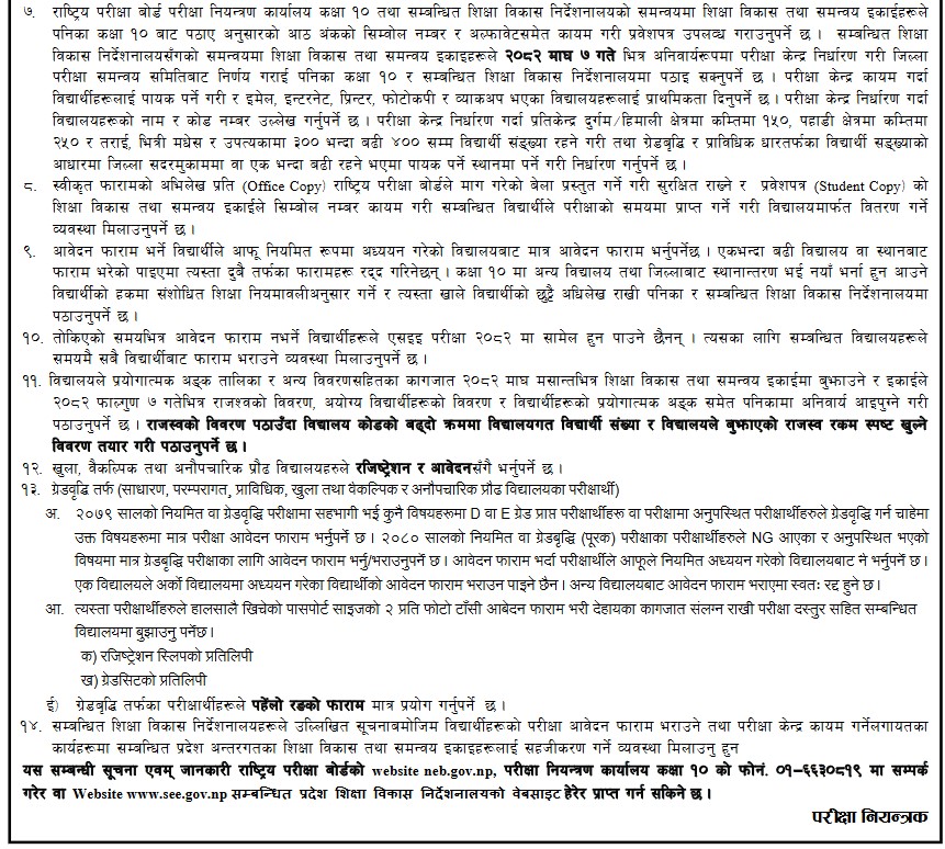 कार्तिक १७ जनकपुरधाम। राष्ट्रिय परीक्षा बोर्ड, परीक्षा नियन्त्रण कार्यालय, सानो ठिमी भक्तपुरले २०८२ सालमा सञ्चालन हुने माध्यमिक शिक्षा परीक्षा कक्षा १० (एसईई)को परीक्षा आवेदन फारम खुला गरेको छ। कार्यालयले आज सूचना जारी गर्दै एसईई परीक्षामा सहभागी हुनको लागि कक्षा १० माध्ययनरत विद्यार्थीहरूले आजदेखि आगामी मंसिर १७ गतेसम्ममा फारम भर्न सक्ने जनाएको छ।आवेदन फारम दस्तुर पाँचसय रुपैयाँ तोकिएको छ।थप जानकारीको लागि हेर्नुहोस् सूचना